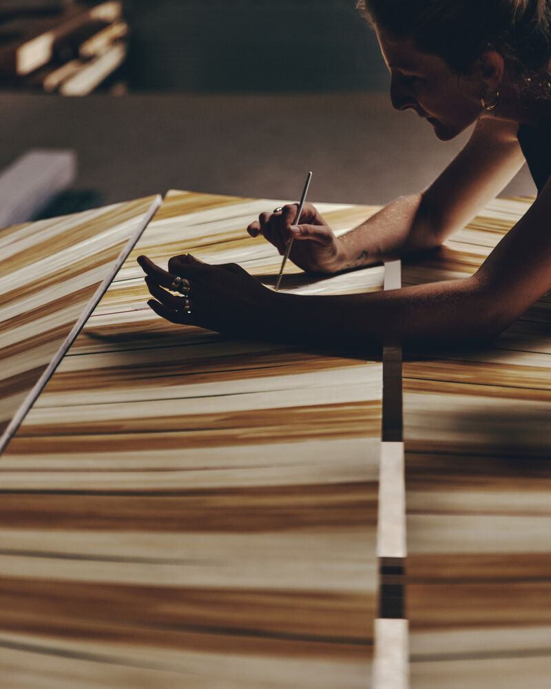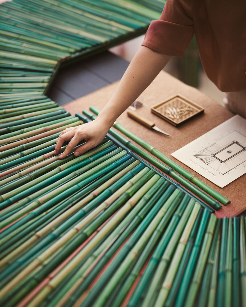 La vitrine centrale a été réalisée en marqueterie de paille par l’artiste Olga Thune‑Larsen. Sa création dessine un écrin rayonnant au centre duquel des touches de vert et de rouge représentent la Maison tout en rendant hommage aux cultures asiatiques, où cette couleur porte un sens profond.