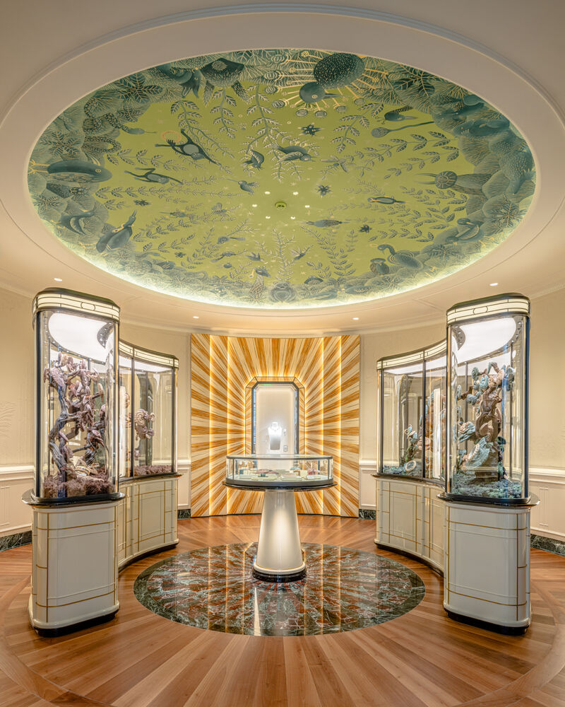 Préserver et célébrer ce patrimoine s’est imposé comme une évidence. La Maison a choisi d’honorer cette double culture en conservant l’identité architecturale du lieu, tout en y inscrivant ses propres codes Art Déco : symétrie, accents métalliques, taille émeraude.
