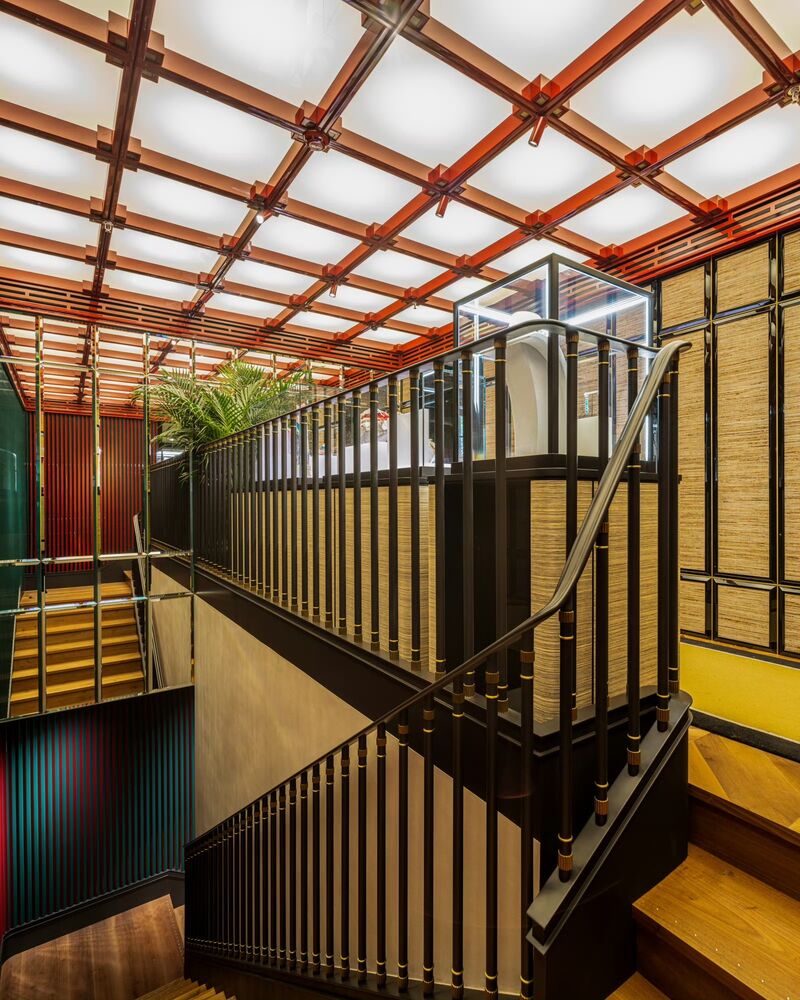La fusion entre l’univers Boucheron et la Chine s’exprime parfaitement au niveau de l’escalier menant au salon VIP. Au mur, des prismes de métal cachent une surprise : d’un côté, ils arborent le vert émeraude iconique de la Maison – de l’autre, c’est le rouge, couleur emblématique du pays, qui est représenté. La rampe, aux accents Art déco, accompagne le mouvement, tandis que le mobilier Boucheron, habillé de raphia, répond aux portes de l’espace VIP traitées dans le même esprit. Le tout est sublimé par un plafond lumineux, inspiré de l’architecture traditionnelle chinoise.