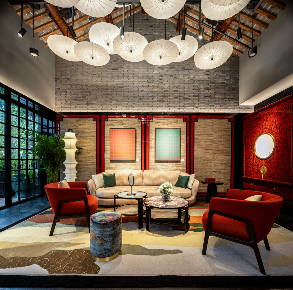 Pensés comme de véritables salons de maison, deux espaces VIP offrent une ambiance intime et chaleureuse. L’âme des shikumen s’y révèle pleinement : charpente apparente, briques d’origine, traces du temps préservées qui affirment l’authenticité du lieu. Ici, l’accueil est personnel, précis, et chaque détail a été pensé pour donner vie à l’esprit de famille de Boucheron. Un canapé en raphia aux motifs d’inspiration orientale répond à des tapis aux reliefs montagneux, tandis que les boiseries, cabinets chinois, fauteuils et plateaux de tables en marbre alternent entre verts et rouges, mêlant harmonieusement l’esthétique des deux cultures. Sur les murs, un papier peint De Gournay sur fond de feuilles d’or déploie un paysage asiatique onirique. Il est directement inspiré de l’œuvre majeure de Wang Ximeng, « Mille lis de rivières et montagnes », aujourd’hui exposée au musée du Palais Impérial de Pékin.