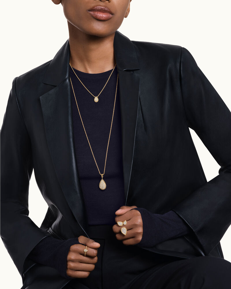 Sur la photo ci-contre, le mannequin porte le collier S en longueur 44 cm et le sautoir L en longueur 80 cm.