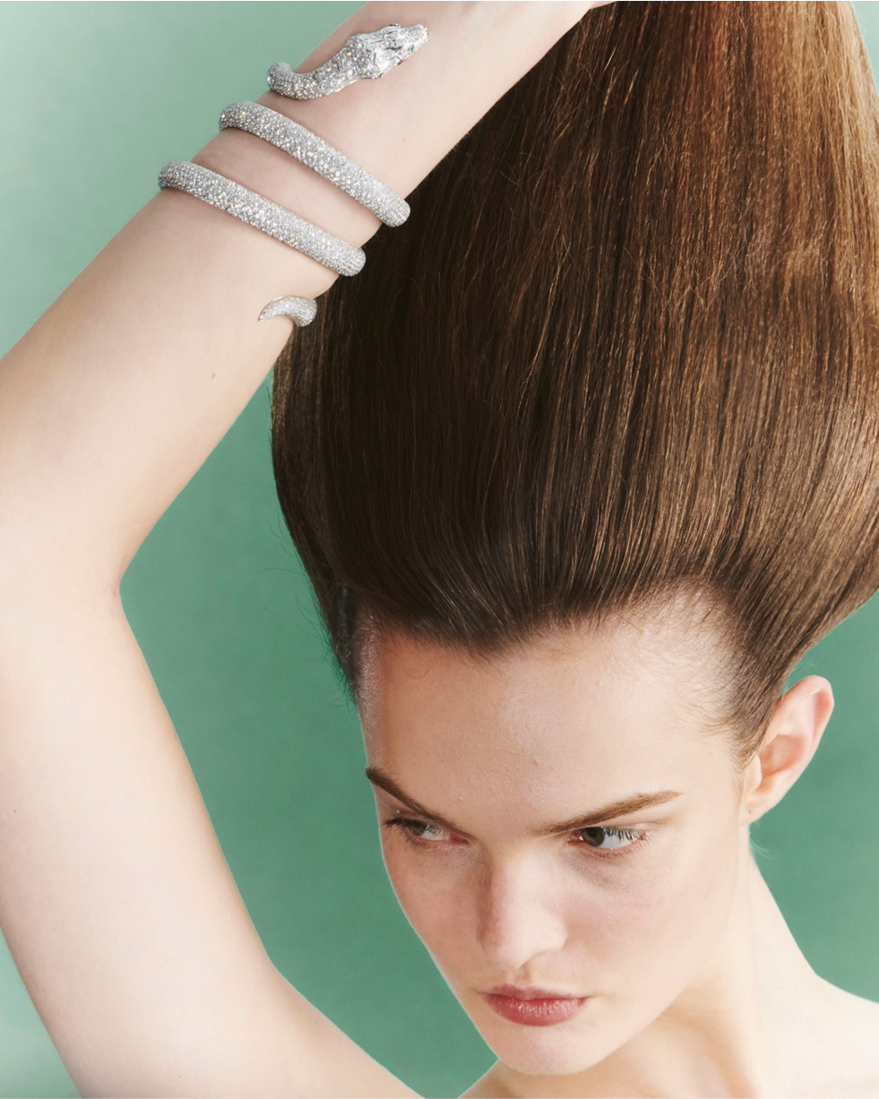 A palette of beige, sand, and blonds illuminated by the sunlight as the warm wind sculpts a silhouette on the dunes: the Femme Sable (Sand Woman) set is an invitation to a dream-like desert, a vast space of harmonious curves, home to extraordinary animals. Here stones meet plants and precious materials meet rattan. The High Jewelry traditionally gives a suppleness to hard materials, such as metals and stones; here, the craft rigidifies a supple natural material, to create this spectacular association of rattan and diamonds.
