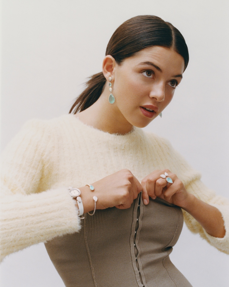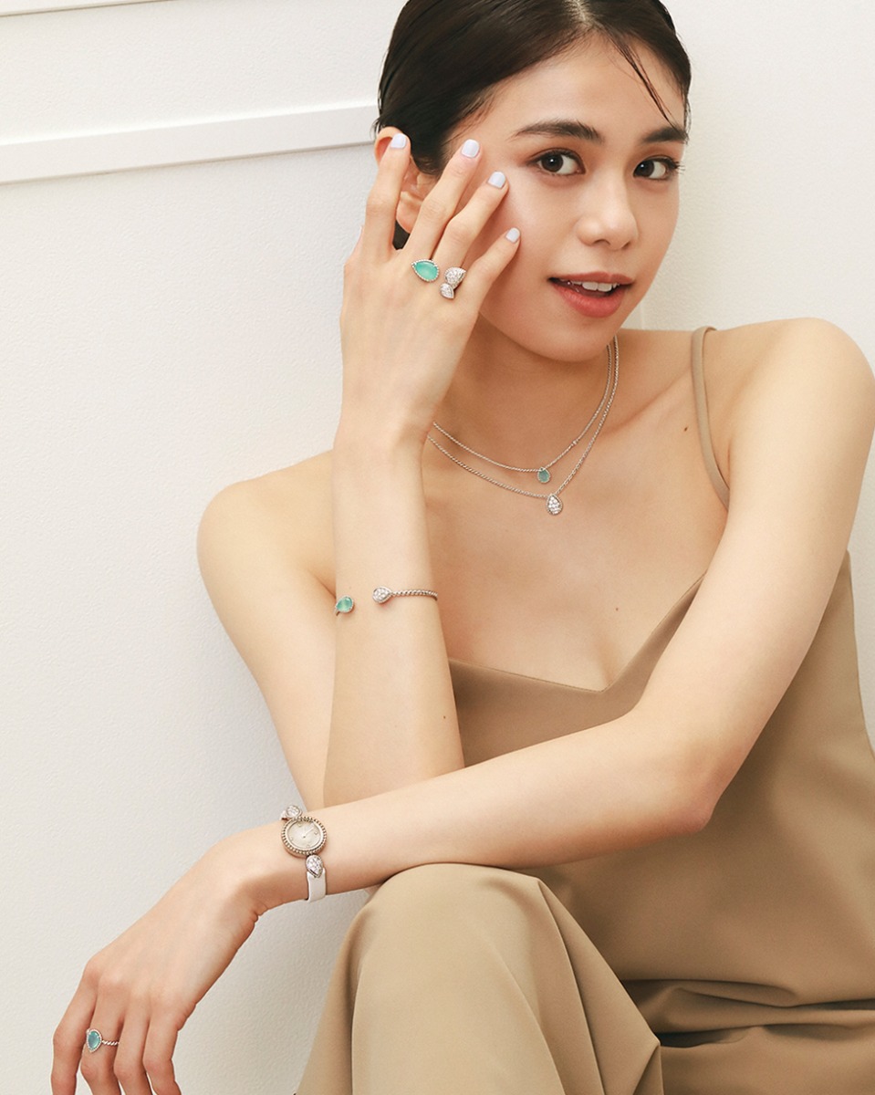 「みずみずしいブルーグリーンに惹かれました」と佐藤晴美さん。新作の「セルパンボエム」に用いられているアクアプレーズは、近年ジンバブエで初めて発見され、2015年に宝石研究機関のGIAに認証された新しい宝石。佐藤晴美さんはネックレス、リング、ブレスレットを重ね着けし、同コレクションのステンレススティール製のウォッチで仕上げたスタイルを披露。「ジュエリーは重ねづけするのがマイスタイルです。これからの季節にも映えるブルーグリーンのジュエリーを主役に、夏のおしゃれを楽しみたいですね」。