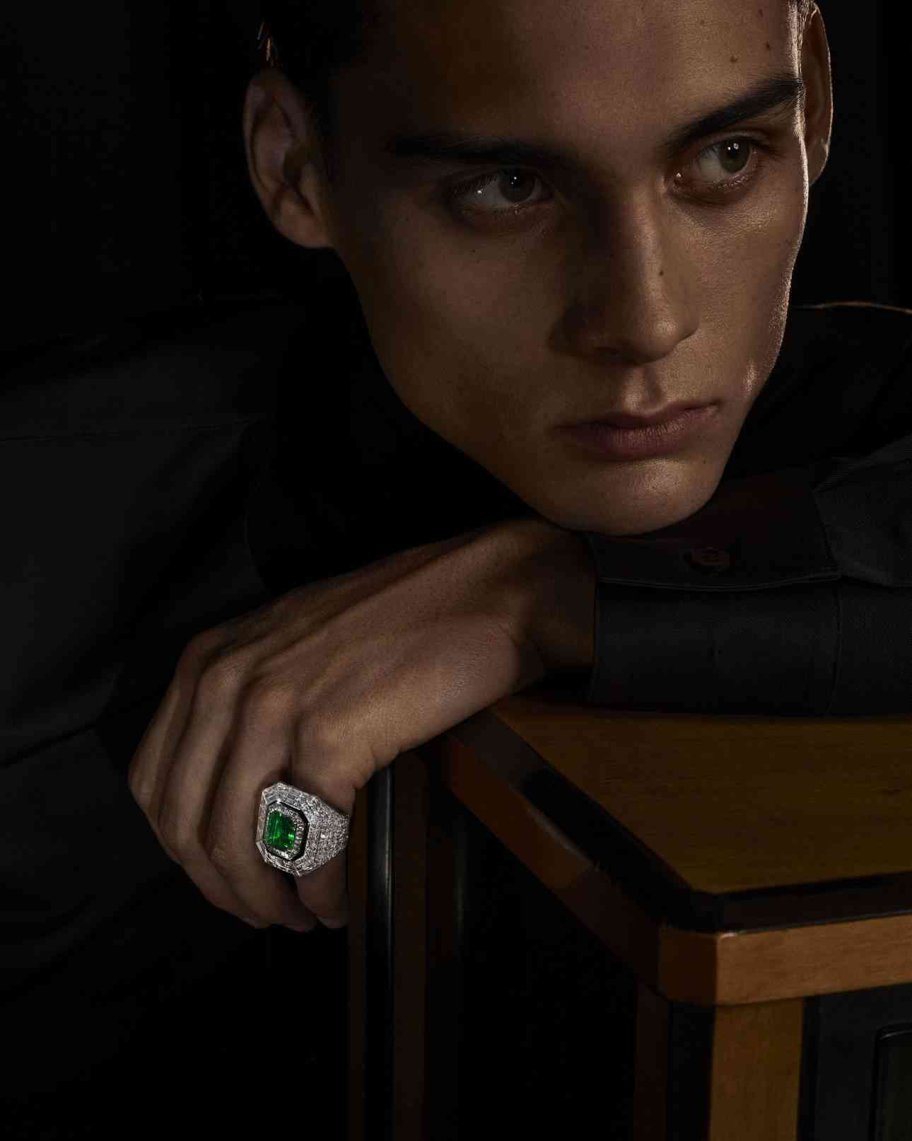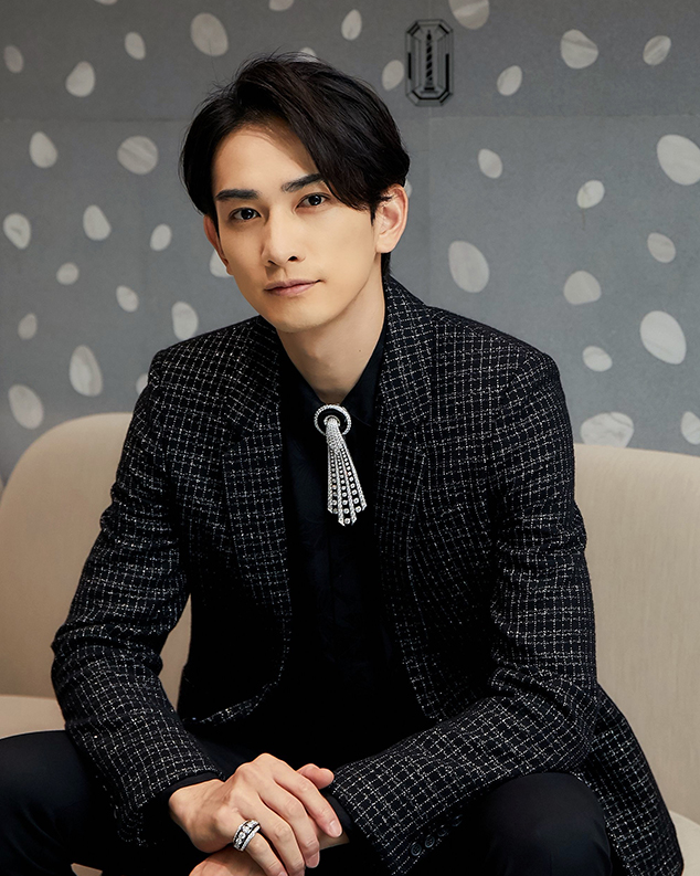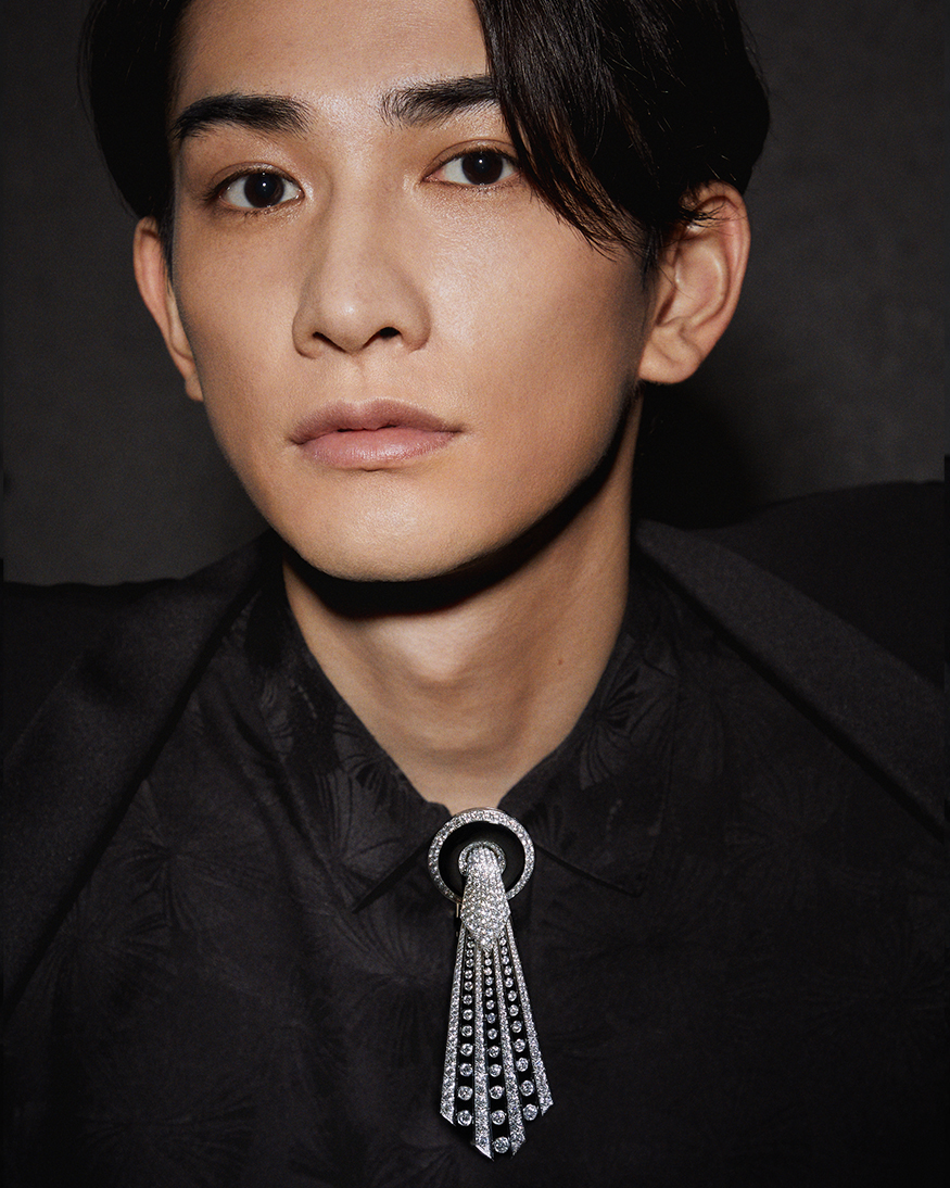 また、オニキスとブラックラッカーが漆黒の光を称え、敷き詰められたダイヤモンドが輝く「ラヴァリエール ディアマン」をまとったのは町田啓太さん。町田さんがジャケットスタイルにタイドアップするように合わせたのはクラバットのようなマルチウエアジュエリー。「パーティなどのドレスアップシーンでは、ネクタイの代わりにこのハイジュエリーをタイのように身に着けたら、とてもおしゃれだし、優雅な気分に浸れそうですね。新感覚の正装として挑戦してみたいです」。