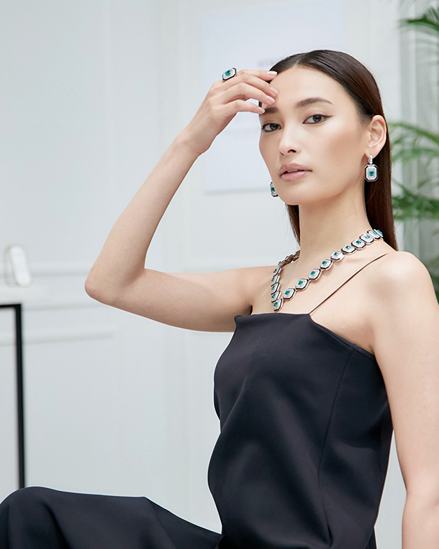 大政絢さんが纏ったのは、「コル エメロード」のネックレス。パリ・ヴァンドーム広場のフォルムを思わせる八角形のオニキスに縁取られたエメラルド28石を水平に配置した斬新なデザインです。シックなブラックドレスルックをモダナイズした大政さんは、「ため息が出るような美しいハイジュエリーを身に着けると、とてもラグジュアリーな気分になります。このコル エメロードは、直線的なデザインやグリーンとモノトーンのコントラストによって、ドレススタイルもハンサムに昇華できるのが大きな魅力ですね」