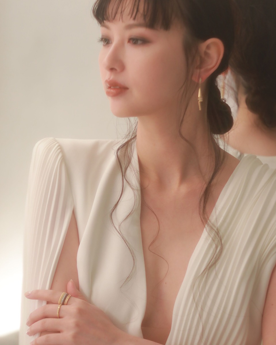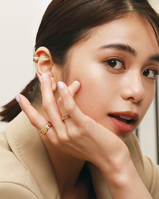 鈴木えみさんがスタイリングの主役に選んだのは、ブシュロンの自由な精神を反映するアイコンコレクション「ジャック ドゥ ブシュロン」。グラフィカルなクラスプはダイヤモンドのファセットのように輝きを放ちます。「上品なイエローゴールドの輝きを耳元と腕元にプラスして、コーディネートのポイントに。」ブシュロンのデザインコードが重なる大胆な「キャトル クラシック」のリングと合わせて、エレガントなホワイトのドレススタイルをモードに昇華。