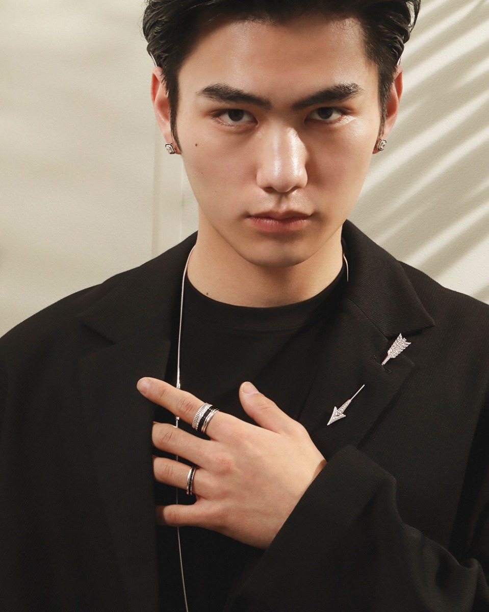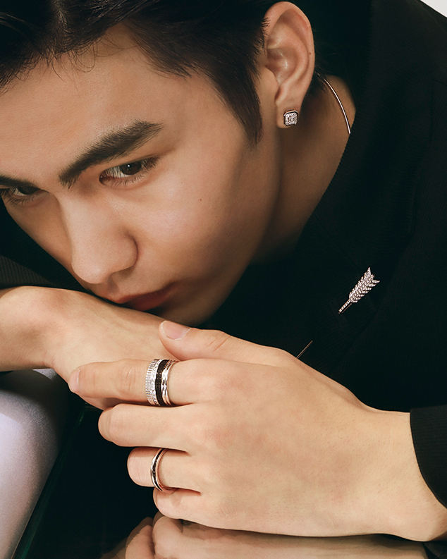 太さの違う「キャトル ブラック」のリングを2つ選んだ大平修蔵さん。「ダイヤモンド使いのリングに挑戦してみたかったんです。この「キャトル」のリングはブラックPVDとのコンビネーションなので、男性でも着けやすいですね。カジュアルスタイルにもマッチしそう。」さらに「ジャック ドゥ ブシュロン」のロングネックレスをさりげなくまとい、矢のモチーフの「フレッシュ 」のシングル スタッズイヤリングをピンブローチ風にアレンジするなど、大平さん流のスタイリングを表現。