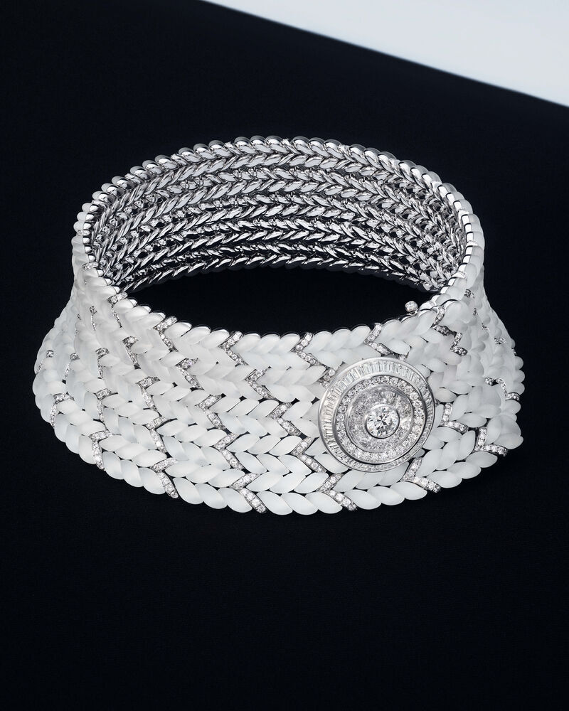 이를 위해, 원하는 볼륨감에 따라 화이트 골드 프레임을 조각합니다. 둥근 부분을 클로즈드 세팅 다이아몬드로 장식합니다. 에나멜링 시스템으로 유연한 구조를 완성합니다. 어깨 견장을 커프스로 변형해 주는 독창적인 잠금장치를 제작합니다.