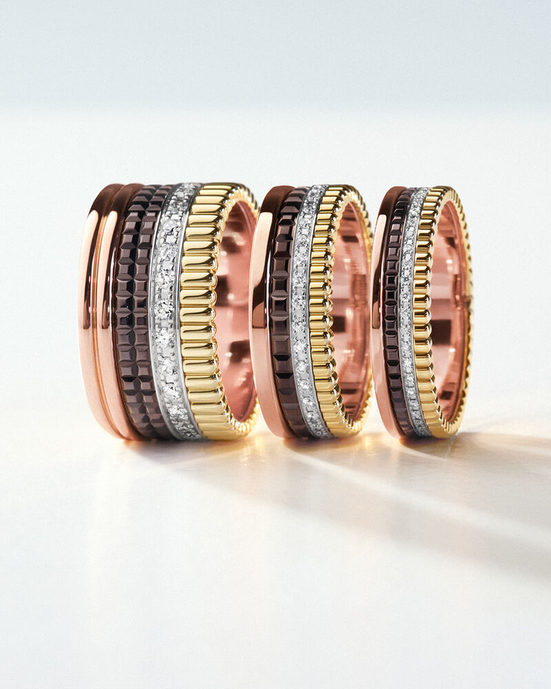 Quatre 系列 Mini 作品。經典,精髓所在。小巧尺寸,彰顯大膽率性風格。四款 Boucheron 寶詩龍歷史檔案中的經典元素,層疊交融。