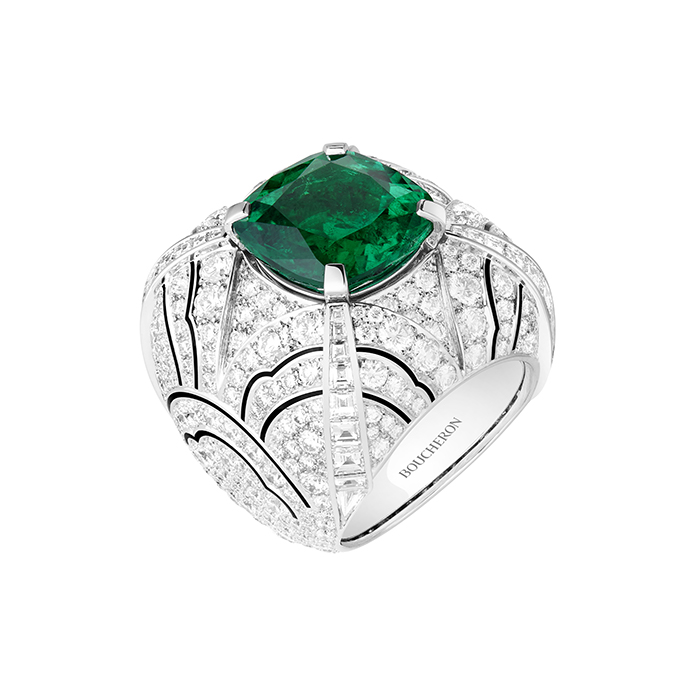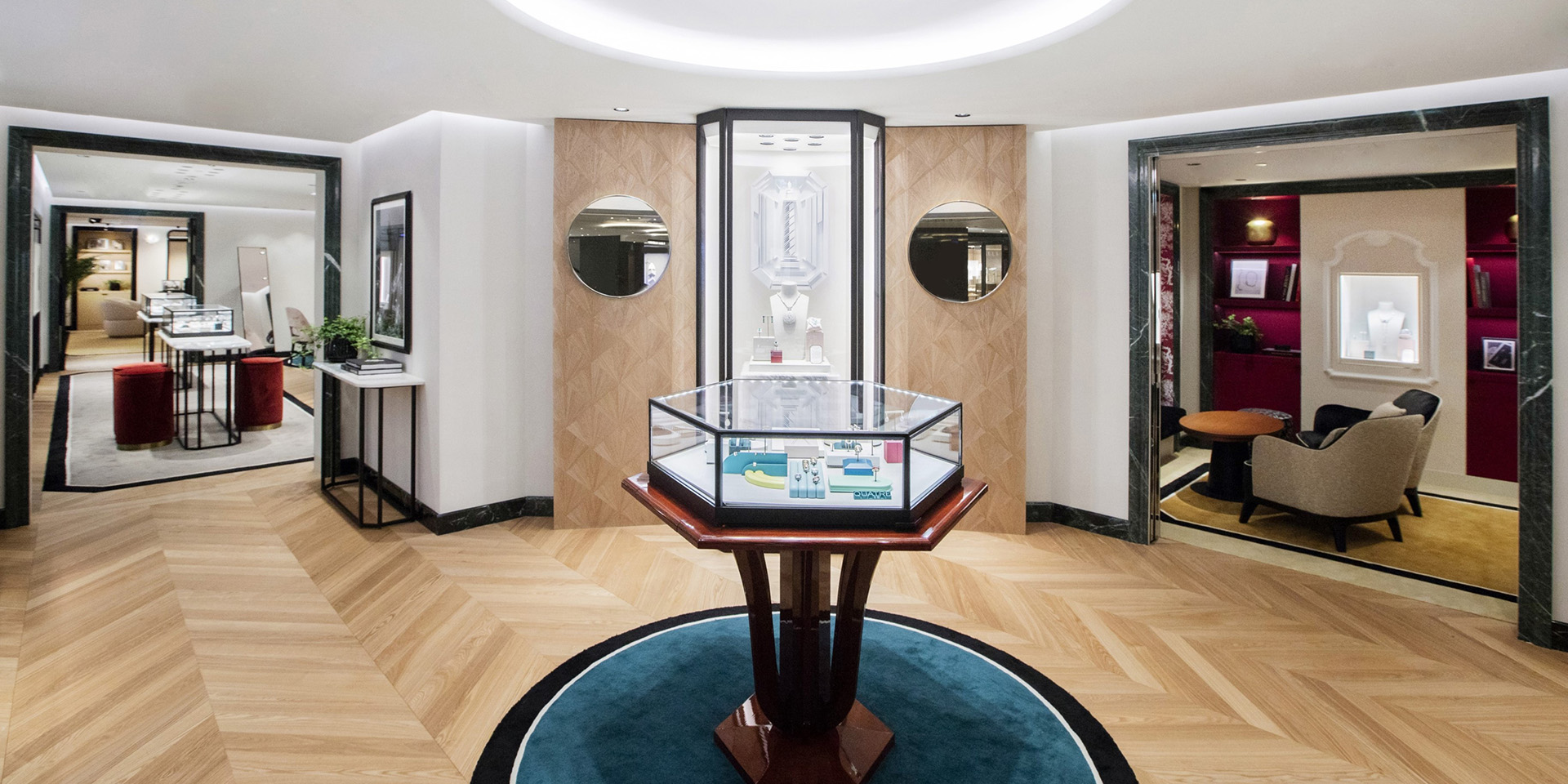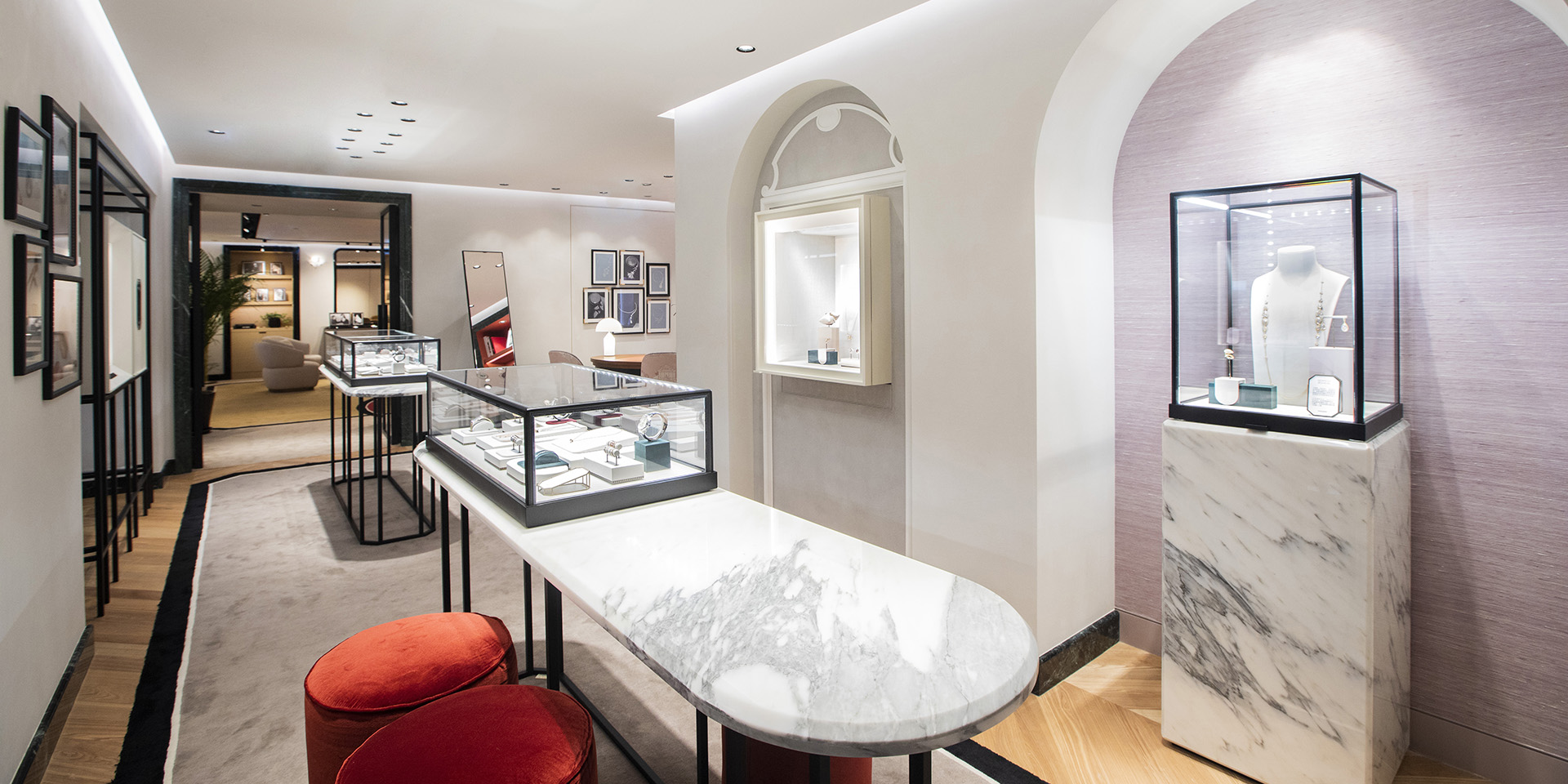 Boucheron寶詩龍麗晶精品店全新形象展示了獨特的巴黎風格設計,讓人想起巴黎芳登廣場上歷史悠久的寶詩龍之家。其寬敞的內部空間融合了Boucheron寶詩龍設計理念的所有代碼:在現代沉穩的氛圍中展示Boucheron寶詩龍最令人難以置信的作品。此處也重新詮釋了芳登廣場典型建築的詞彙:它具備了象徵巴黎的元素,例如深色大理石的模製框架、黑色金屬框架和法國古典主義特有的對稱性,將其變成了標誌性的識別設計。